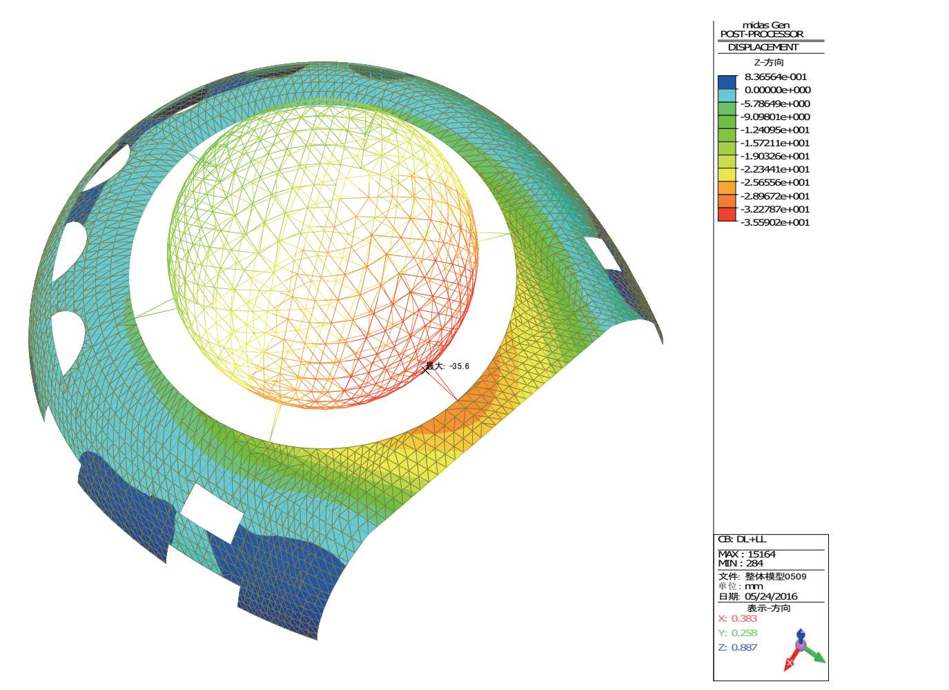 恒+活作用下球幕影院结构的最大竖向位移为-35.6mm,位于球体与混凝土壳体开口处跨中(图 2-36),挠跨比为 41 500/35.6 = 1 166,满足结构设计规范 1/400 的限值要求。