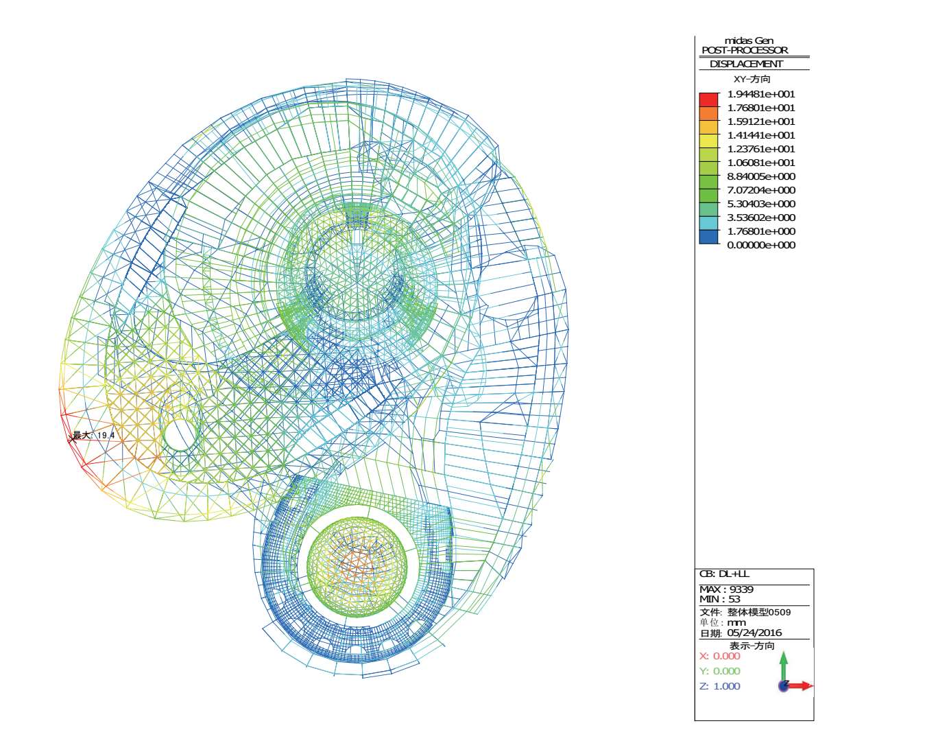 恒+活作用下整体结构的最大水平位移为 19.4mm,位于大悬挑区域悬挑端部(图 2-28)。