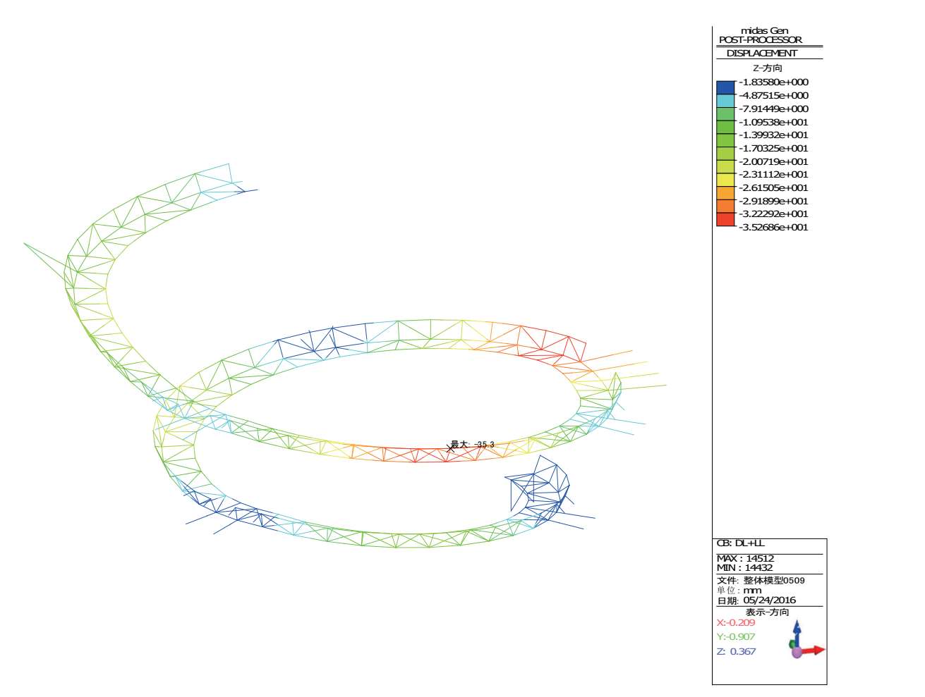 图 2-34 恒+活作用下倒转穹顶区域旋转步道的竖向位移