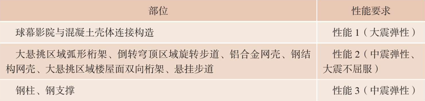 大悬挑区域弧形桁架、大悬挑区域楼屋面双向桁架、倒转穹顶区域旋转步道、铝合金网壳、钢结构网壳需满足中震弹性和大震不屈服的性能目标,中震和大震反应分别按照小震反应谱和时程包络值乘以 3 和 6.25 的放大系数计算。