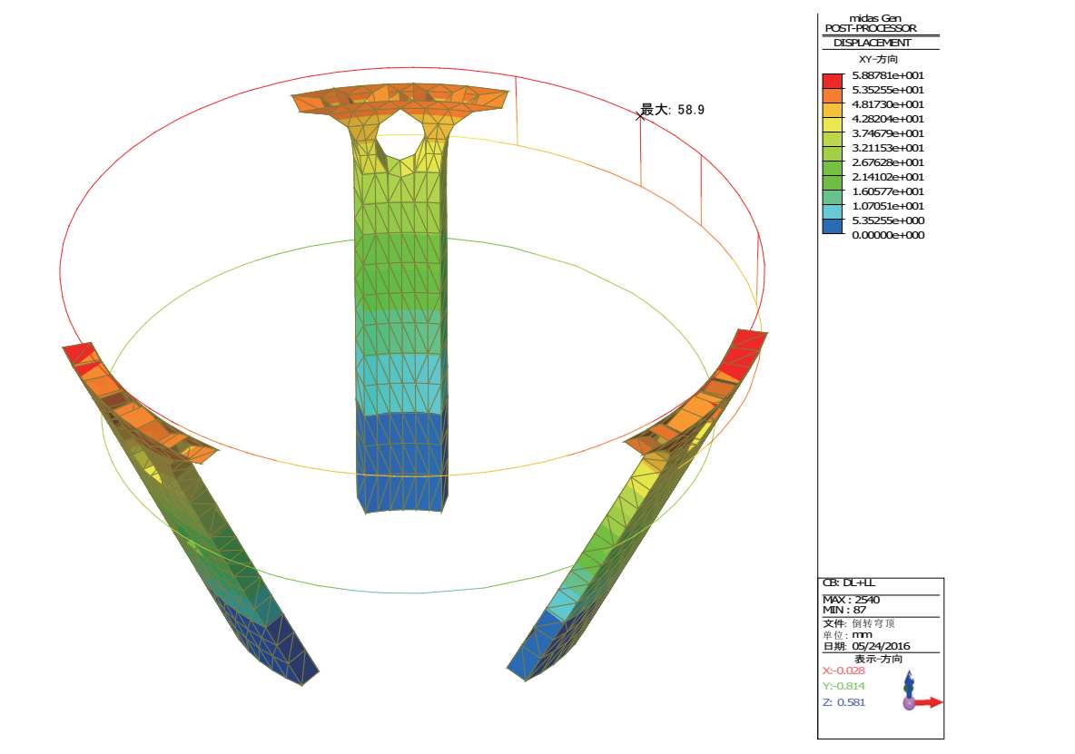 恒+活作用下倒转穹顶区域“三脚架”结构的最大水平位移为 58.9mm(图 2-44),结构较大的水平位移是由“三脚架”不对称布置造成的,北侧立柱倾角较小,而南侧两根立柱倾角较大,有往外倒的趋势。而整体模型中由于有周边楼板及框架的约束作用,其位移大大减小。