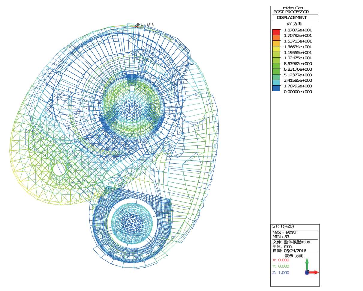 升温 20℃作用下整体结构的最大水平位移为 18.8mm,位于北侧外立面上(图 2-29)。