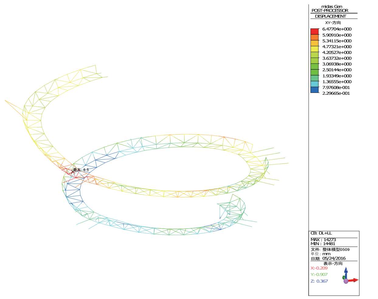 恒+活作用下倒转穹顶区域旋转步道的最大水平位移为 6.5mm(图 2-35)。