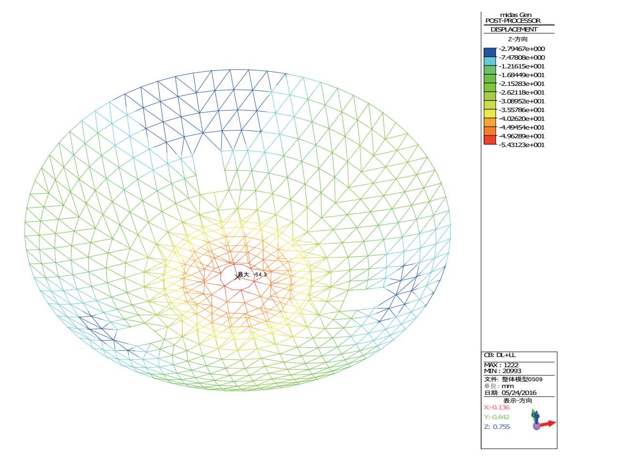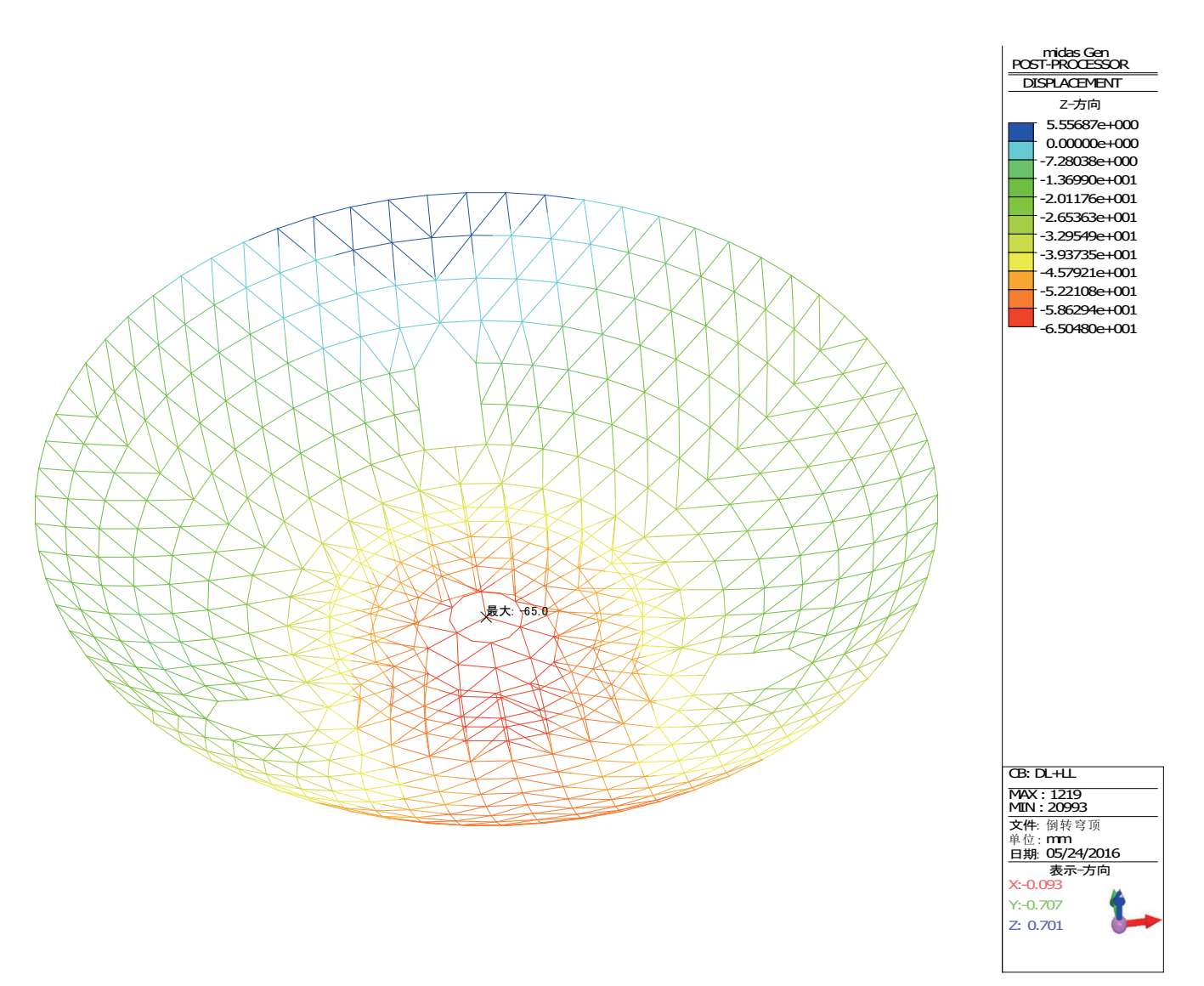 图 2-42 恒+活作用下倒转穹顶区域网壳结构的竖向位移