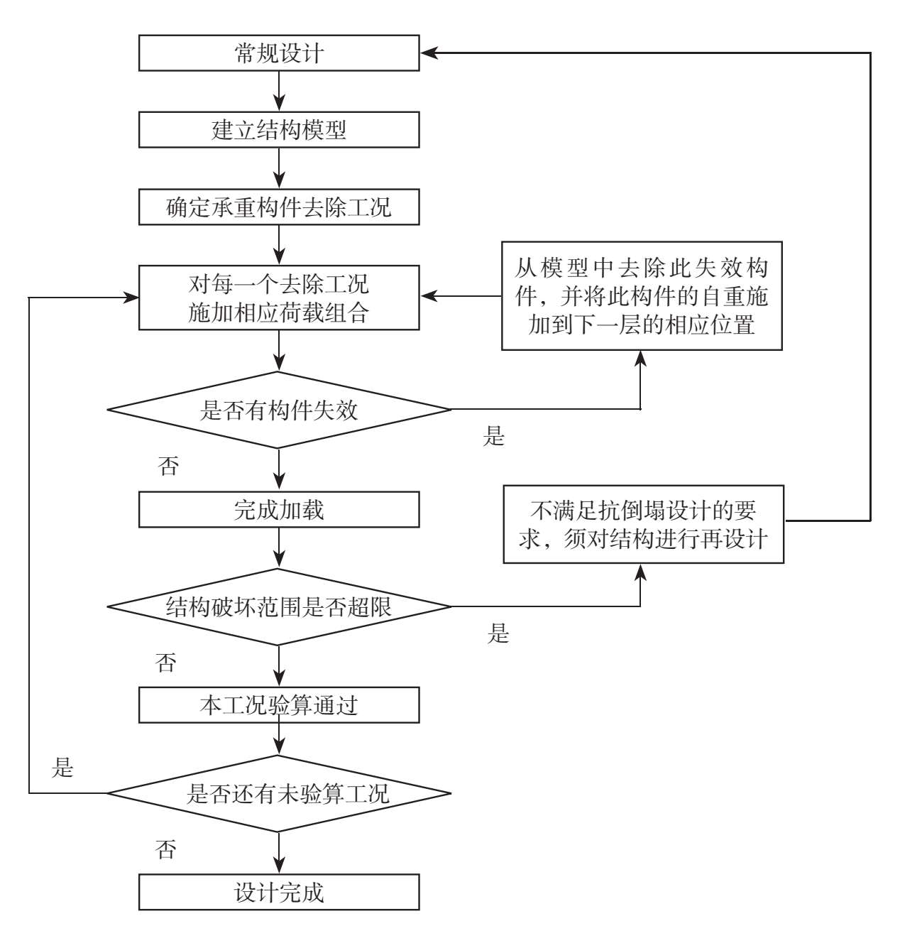 目前常用的防倒塌设计方法有替代荷载路径法,即通过人为去除结构的关键构件,进而研究剩余结构是否连续倒塌,其设计流程如图 2-26 所示。