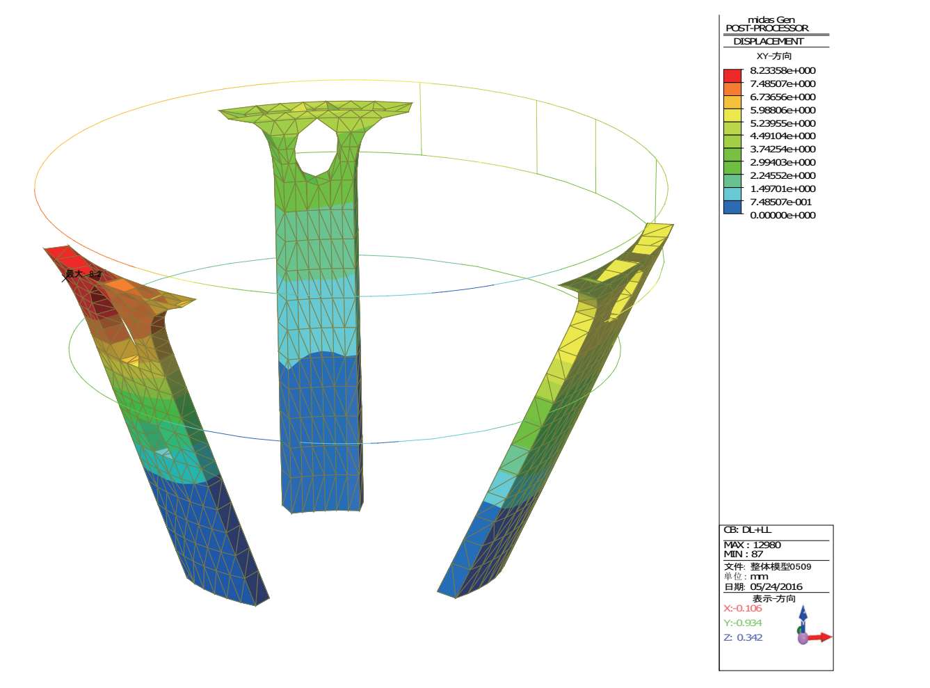 图 2-33 恒+活作用下倒转穹顶区域“三脚架”的水平位移
