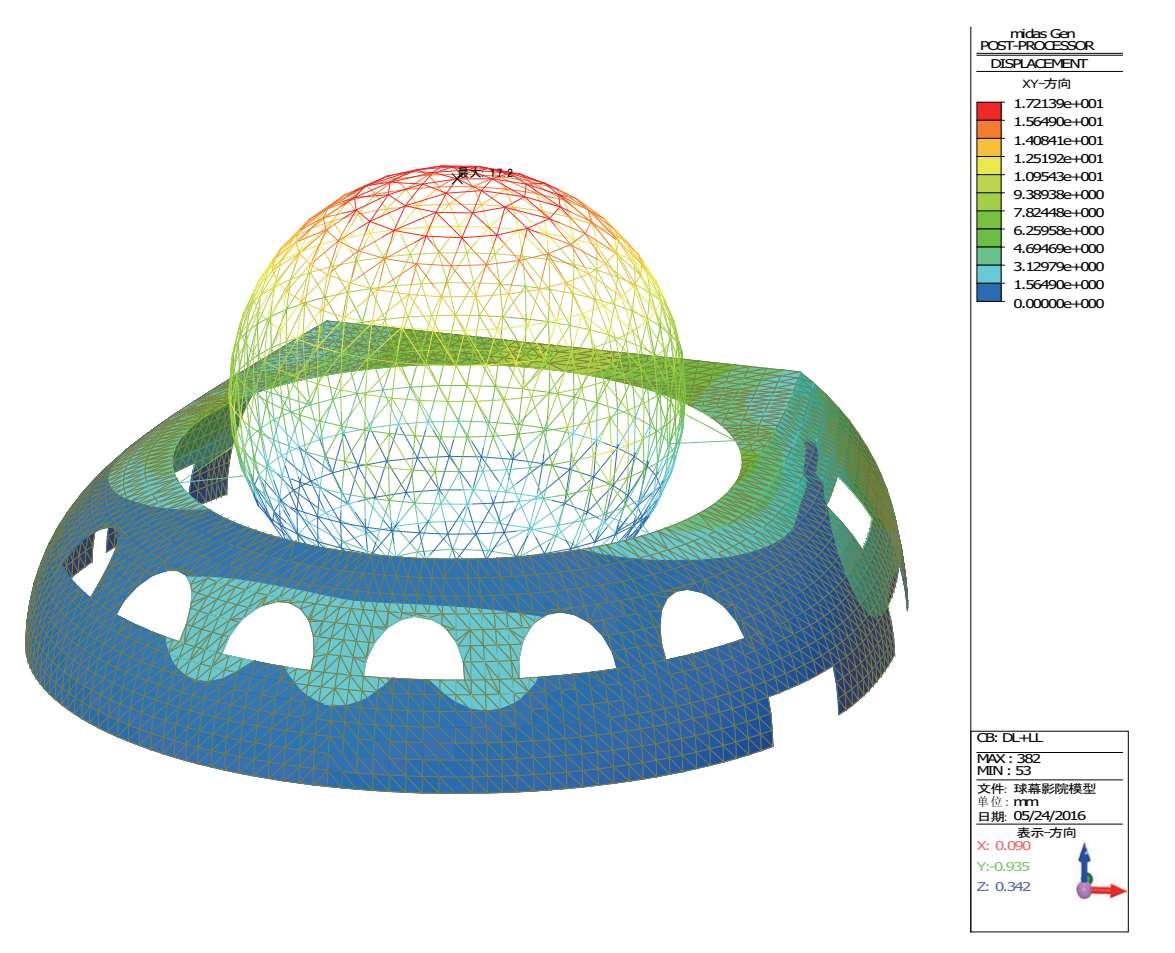 恒+活作用下球幕影院结构的最大水平位移为 17.2mm(图 2-49)。相比于整体模型只增加了 1mm不到。