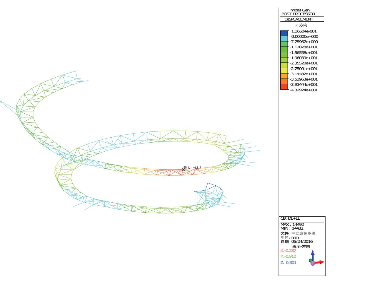 图 2-45 恒+活作用下倒转穹顶区域旋转步道的竖向位移