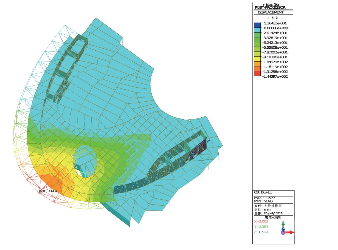 恒+活作用下结构的最大竖向位移为-144.4mm(图 2-39),相对于悬挑长度 37.6m的挠跨比为 37 600/144.4 = 260,仍满足规范 1/200 的限值要求。同时,与整体模型相比只是增加了 4mm。说明大悬挑区域结构比较独立,周边结构对其性能影响很小。