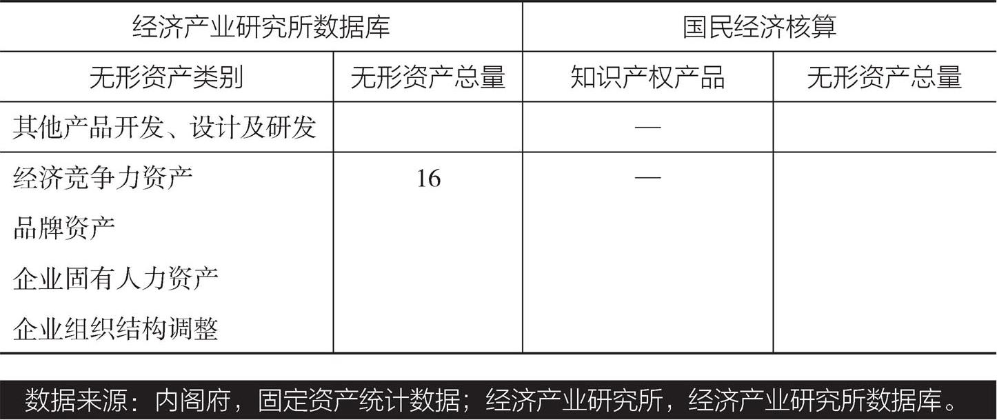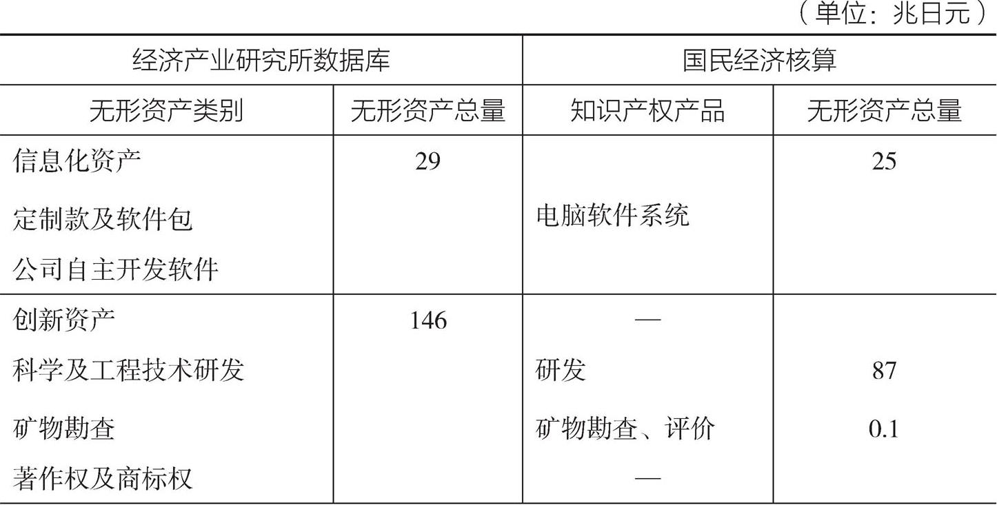 这样的话,在经济产业研究所数据库测算的无形资产中,就包括了几乎全部的信息化资产和50%左右的创新资产。还有一些被认定为无形资产,但在国民经济核算时尚未被列入固定资产及设备投资范畴,例如创新资产中的创意及设计等知识产权、包含在经济竞争力中的人才培训等,这些都可以衡量企业的特殊人力资源及企业的发展质量,属于经营状况及品牌力等范围。表1-1是无形资产总量与知识产权产品的数据。