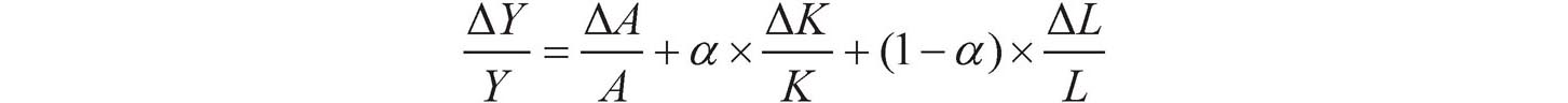 即国内生产总值增长率=全要素生产率增长率+资本产出份额×资本总量增长率+劳动产出份额×劳动投入量增长率