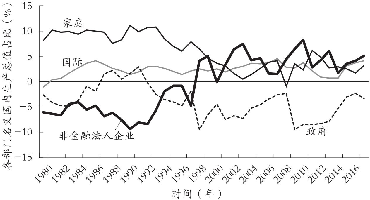 一般政府部门在泡沫经济崩溃之后转向投资过剩(资金不足、财政赤字),而且此后赤字一再扩大,主要是因为经济低迷,再加上需要不断运作财政来调控经济。到21世纪初期,由于抑制财政支出、经济复苏等因素,赤字幅度减小。世界金融危机时赤字虽然再次扩大,但此后一直呈缩小态势。在此期间,国际部门一直保持经常项目收支盈余状态,2012—2014年,因贸易收支出现赤字,盈余大大缩减,但与其他三个部门相比,一直处于相对稳定的状态。