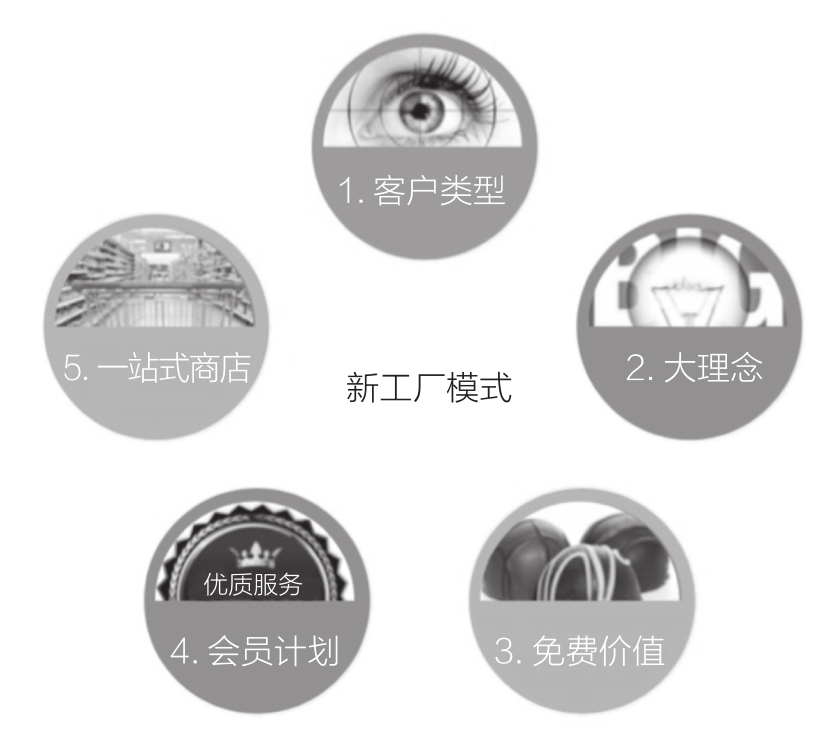 在本书的最新版本中,我们将探索你能够获得的最大机会。我们设计了新工厂思维五步蓝图(图1),即决定你真正想服务的对象、赋予大理念、提供免费价值、把客户变为会员、让会员进入一站式商店,并就如何创造和包装新型价值给出诸多想法。此版本还包含一些图示和插图,有助于你思考新工厂思维的一些原则,但它们往往是反直觉的。我曾在演讲和工作坊中讲授新工厂思维,还与“大想法冒险培训计划”的会员举行会谈,并基于上述经验更新了一些术语。我改进了一些词语和表达方式,令概念更易于理解和应用。