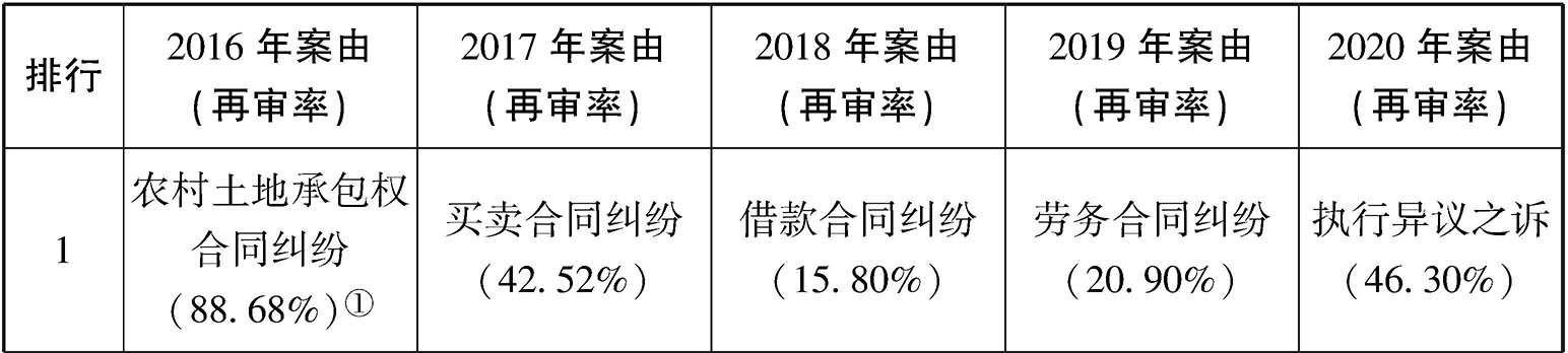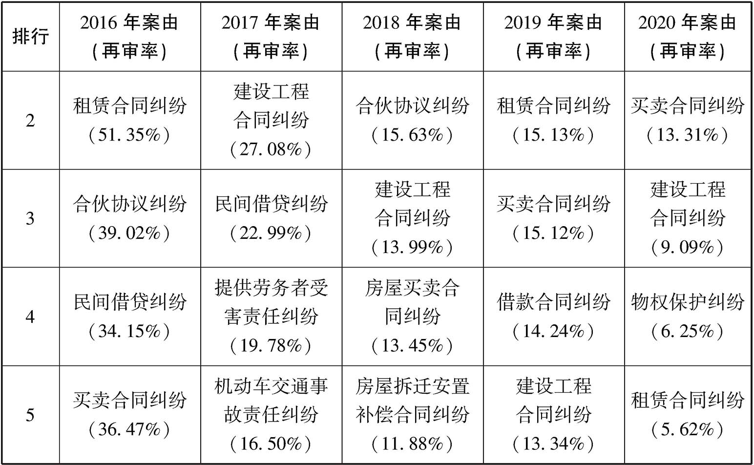 同时,从表1-8中可以看出,民事案件的再审率并无特定规律,而是根据当年的特殊情形存在一定的偶发性。比如,受2016年到2017年四川地区房价突飞猛进和政策调整的影响,房屋买卖合同纠纷剧增,且争议的案件主要为二手房买卖。随着2016年《四川省高级人民法院关于审理民间借贷纠纷案件若干问题的指导意见》的发布,随后几年民间借贷纠纷再审率均呈现较高态势。2020年,四川高院关于执行异议之诉案件的再审率猛增至46.30%,这一数据反映出基于2019年年底开始的多种因素的影响,导致各类债权债务的履行存在障碍,进而间接引发执行程序中相关纠纷的爆发。