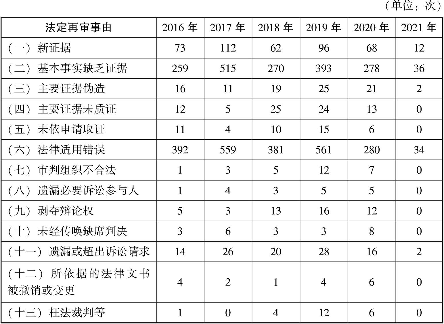 从表1-5中可以看出,历年来当事人申请再审所适用的法定再审事由均集中在《民事诉讼法》第二百零七条第一项(有新的证据,足以推翻原判决、裁定的)、第二项(原判决、裁定认定的基本事实缺乏证据证明的)、第六项(原判决、裁定适用法律确有错误的)这三项具体的再审事由。尤其是第二项与第六项再审事由,结合表1-4中四川高院历年的再审审查裁定书总数,不难发现在四川高院历年的再审审查案件中,该两项事由均出现在超过一半的再审审查裁定书中。笔者认为,出现如此现象的原因在于,相较于其他再审事由,第二项和第六项再审事由的规定较为模糊,更契合当事人所认为的原审所存在的问题;而新证据适用频次较高的原因在于,多数当事人认为只要是原审未提交过的证据均属于此项所称的新证据。当然,当事人作为普通群众的认识与法院的认识之间存在相当的差异,对此可以参见表1-7以及第三章对各项再审事由的具体分析。