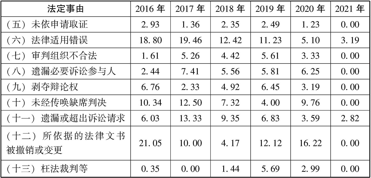 通过表1-6中的数据可以发现,基于当事人申请再审时所依据再审事由的适用频次,法院裁定再审所依据的再审事由适用频次主要也集中于第一项、第二项和第六项再审事由中。但从表1-7可以发现,法院的采纳率并未呈现出明显的集中趋势。基于此,笔者认为,律师在代理民事再审案件时,应当围绕《民事诉讼法》第二百零七条所规定的十三项再审事由,对原审法院作出的生效裁判文书做全面评判,在充分保障当事人权利的同时,更有效地促进裁判尺度的统一,实现再审纠错的目的。