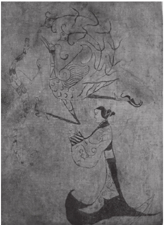 张荫麟说,楚国的成长环境是独特的,“江汉流域的土壤肥美,水旱稀少……楚人的生活充满了优游闲适的空气,和北人的严肃紧张的态度成为对照”(张荫麟:《中国史纲》)。因此楚人的性格和北方民族相当不同。这是一个非常爱美的民族。与中原人崇拜龙与虎不同,他们崇拜凤凰。楚国的凤凰是一种凌驾于一切之上的最高贵、最有神性的动物,它的色彩瑰丽绚烂,它的翅膀如同火焰般升腾流动,它的爪和喙雄健锐利。它象征着美、力量和对世俗的超越。在中原文化中,凤是龙的附庸。而楚国的凤凰却脚踩猛虎,嘴衔巨龙,头向着蓝天。在长沙陈家大山楚墓的《人物龙凤帛画》(图3)中,凤凰处于画面中心,雄武有力,神采飞扬,而龙则可怜巴巴地蜷缩在一边,如同一条丑陋的蛇。
