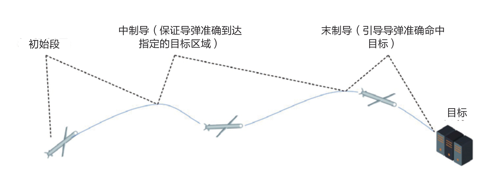 精确制导技术在导弹飞行轨迹中/末段发挥作用示意图