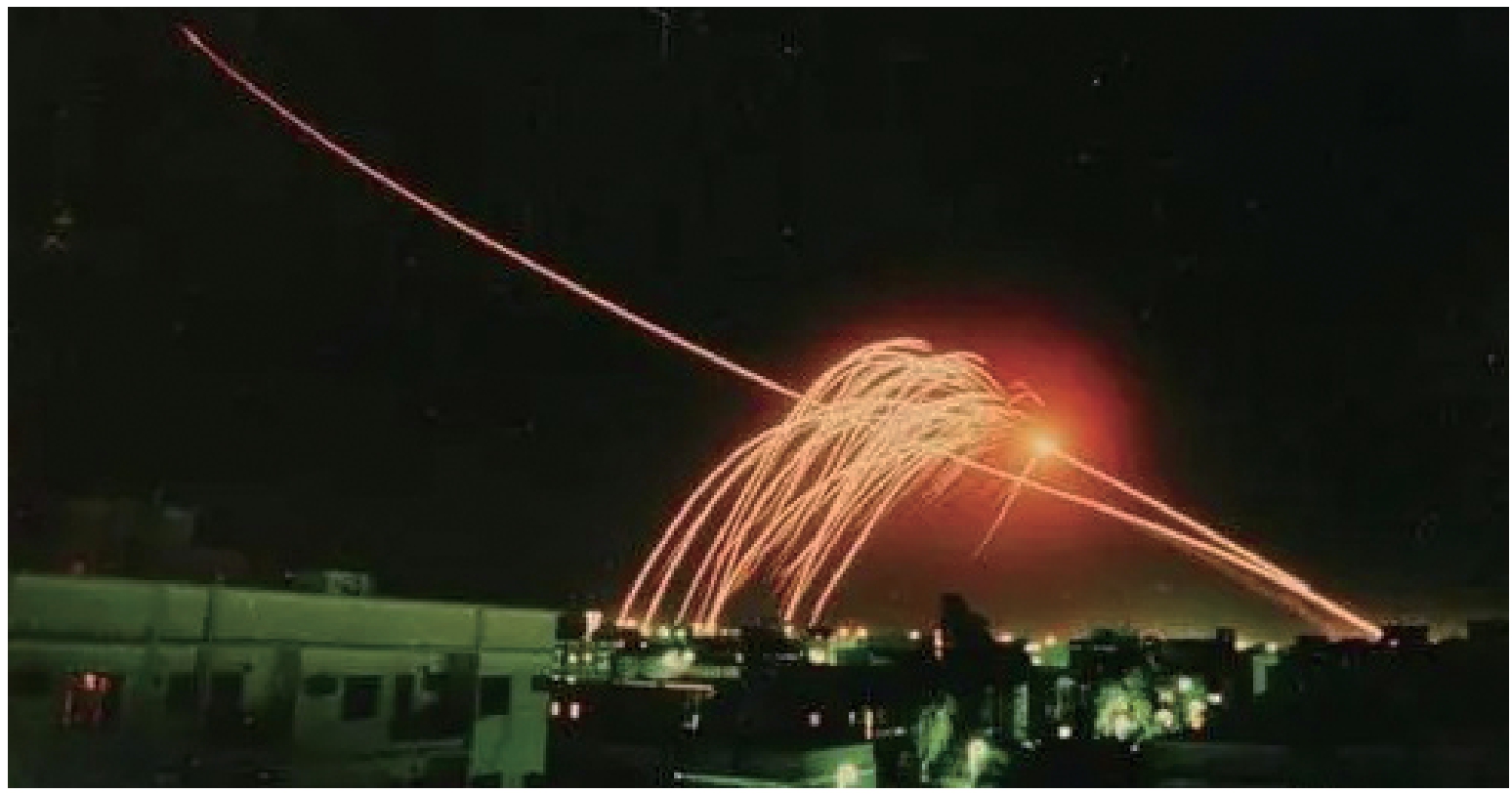 1991年1月18日凌晨,美国空军航天司令部接到导弹来袭警报,随后,多国部队设在沙特阿拉伯的“爱国者”导弹发射阵地实施拦截。下图为“爱国者”导弹在沙特阿拉伯首都利雅得拦截“飞毛腿”导弹的场面。美军同时发射了两枚导弹进行拦截,其中一枚脱靶,另一枚击中目标,碎片和残骸纷纷向下散落,场面非常壮观。