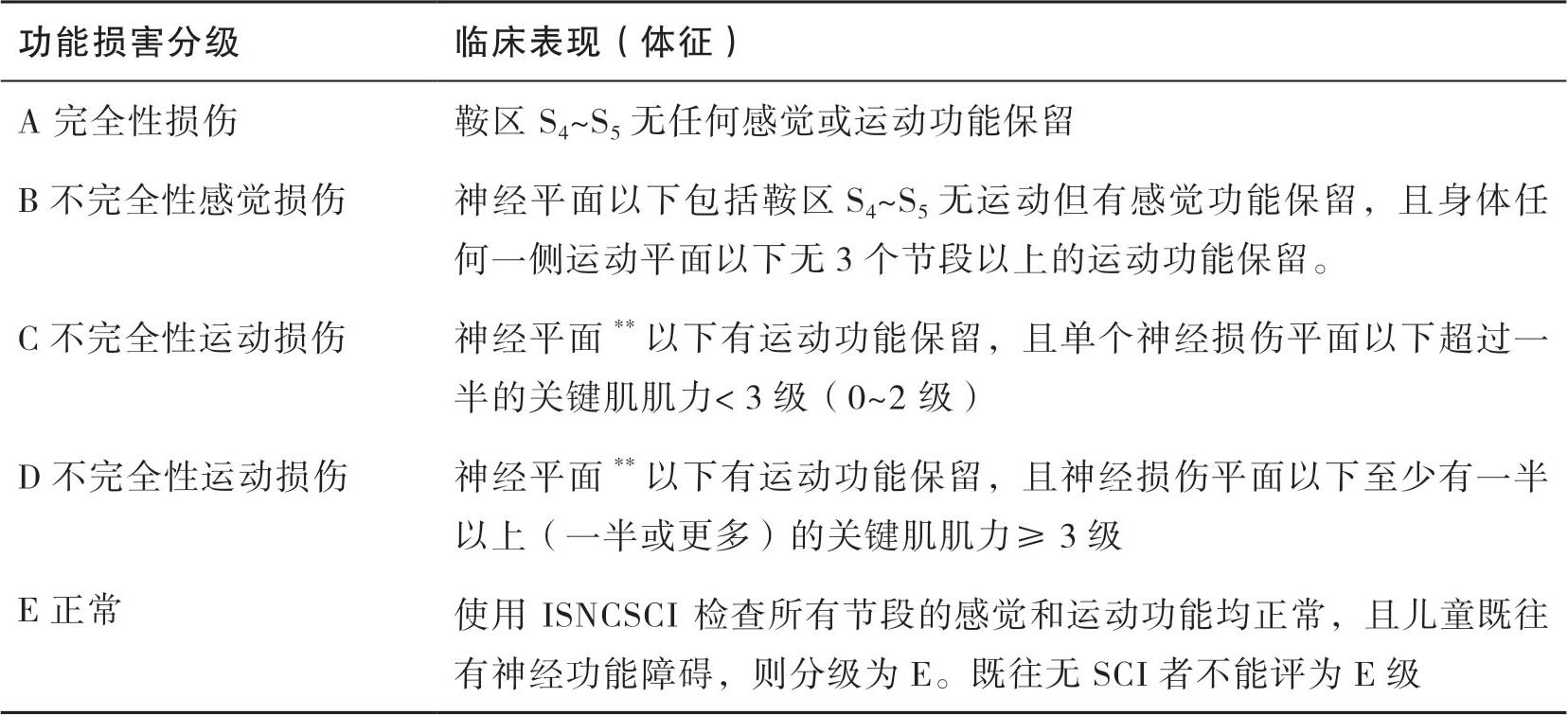 **:如儿童评为C级或D级,即不完全性运动损伤,则需要满足下列之一:①肛门括约肌自主收缩。②鞍区感觉保留,同时身体一侧运动平面以下有3个节段以上的运动功能保留。本标准允许根据运动平面以下非关键肌是否保留运动功能来确定运动损伤完全与否(确定AISA为B级还是C级)。注:当根据平面以下运动功能保留的程度来区分AISA为B级或C级的时候,需要使用的平面为身体一侧的运动平面;而区分C级和D级的时候(根据肌力为3级或以上关键肌数量),使用的平面为单个神经平面