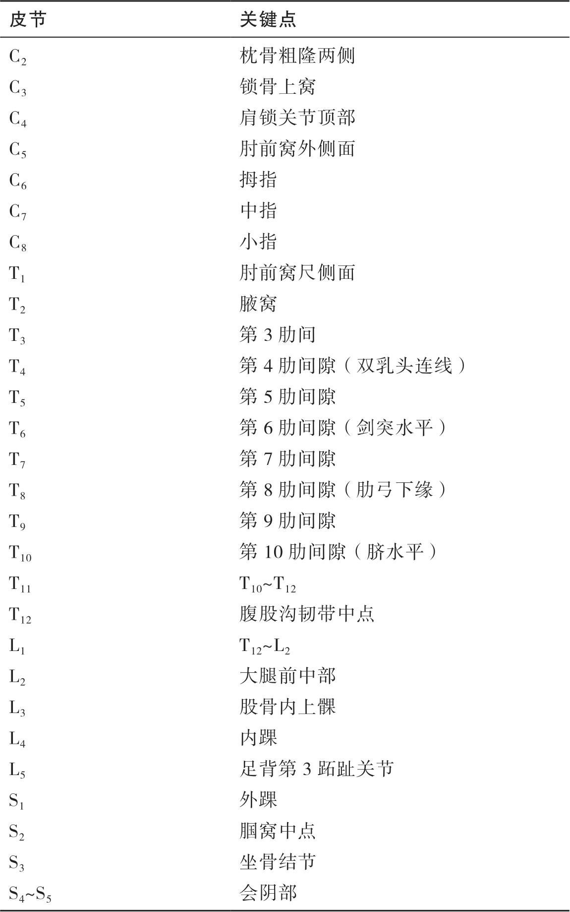 检查内容包括身体两侧28对皮节区关键点(表1-4-1);每个关键点的检查包括针刺觉和轻触觉。