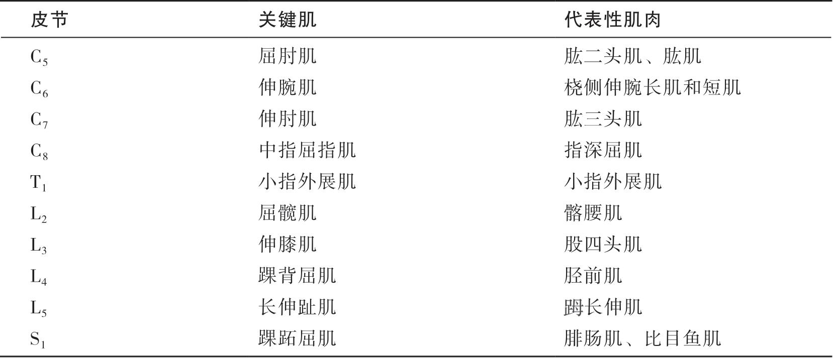 可用关键肌确定运动神经平面(表1-4-2)。关键肌是指确定神经平面的标志性肌肉。根据神经节段和肌肉的关系,用肌力3级以上的关键肌确定运动神经平面,但该平面以上的关键肌的肌力必须达到4级。