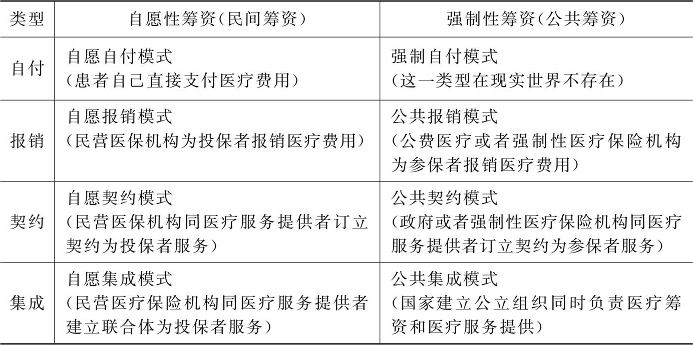 为了更加清楚地定位医保和医疗体系走向有管理的市场化的改革理念和实践,我们这里以筹资方式和支付方式为维度,给出一个医保体系的类型学(参见表3-1)。从筹资上看,简化为两类:一类是自愿性筹资,略等同于民间筹资;另一类是强制性筹资,略等同于公共筹资。从支付上看,简化为四类:一是患者自付,这当然包括患者通过自己或家庭的社会网络进行筹资并支付医疗服务费用;二是报销,即医疗保险机构,无论民营还是公立,为投保者所支付的医疗费用给予报销,此时医保机构的报销面向患者而不是医疗机构;三是契约,即医保机构,无论民营还是公立,直接同医疗服务供方订立契约,为参保者提供服务,其中包括支付医疗费用;四是集成,即医保机构与医疗机构整合成一个体系。