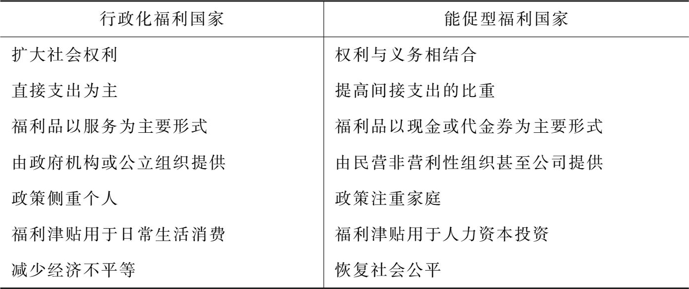 除此之外,能促型福利国家还在其他若干方面与传统的行政化福利国家有所差别。从表1-1可见,除了理念转型和政策变化之外,政策工具的更新也是福利国家治理变革的一环,可以引入包含选择与竞争因素的市场化政策工具,如代金券。不仅如此,有关社会政策治理的研究还将重点从政策项目转移到政策工具。从这个角度来看,即便确定了项目,采用何种政策工具来实施项目也是重要的,有些政策工具依赖于行政机制的运作,而另外一些工具则体现了市场机制或社群机制的作为。关于政策工具的研究,也已经从传统的政策执行研究领域提升到治理转型的新研究领域(Salamon, 2002)。