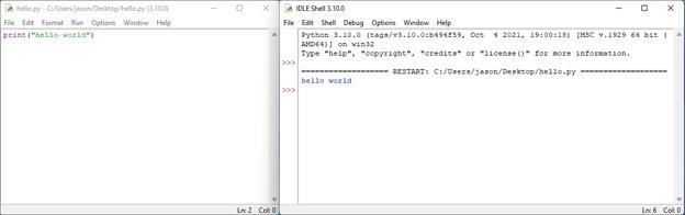 现在,如果你关闭Shell程序窗口,但留着hello.py窗口,然后选择Run->Run Module,那么Python Shell程序会再次出现,并且你的程序会再次运行。(要想不运行程序就重新打开Python Shell程序,选择Run(运行)->Python Shell。)