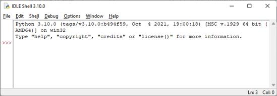 安装好Python后,我们在IDLE(也叫作Shell)中编写第一个程序。如果使用Windows操作系统,在查询窗口(屏幕左下角)输入idle,在出现最符合搜索项的菜单中选择IDLE(64位 Python 3.10)。如果使用苹果电脑,选择Go菜单下的Applications,打开Python 3.10文件夹,找到IDLE。如果使用Ubuntu,单击Show Applications,然后单击下面的All标签,就可以看到一个标题为IDLE(Python-3.10)的入口,如果看不到也可以在搜索框中输入IDLE。如果使用树莓派,单击屏幕左上角的树莓派图标,单击Programming,然后在出现的列表中选择idle3.10。打开IDLE后,你应该会看到图1-8所示的窗口。