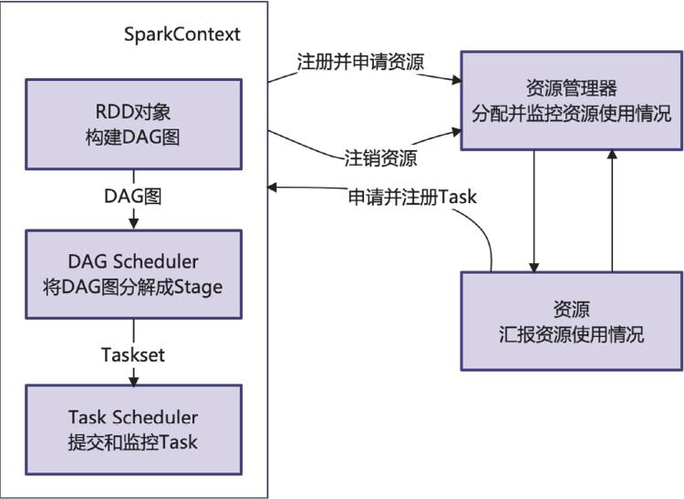 SparkContext负责生成RDD对象,并基于RDD构建DAG图。DAG Scheduler将DAG图分解为Stage,生成Taskset。TaskScheduler提交和监控Task。