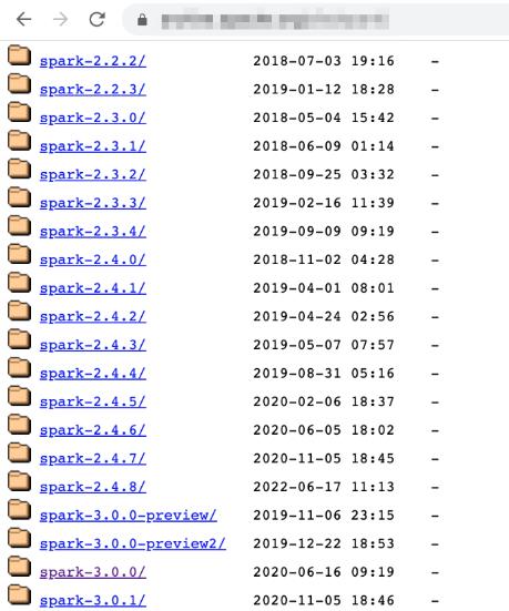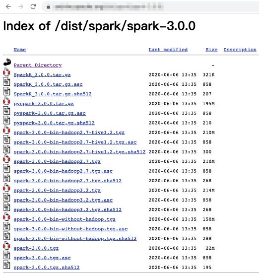 Spark的下载目录如图1-5所示。选择spark-3.0.0进行下载。单击相应的文件夹链接,查看并选择相应的版本进行下载,如图1-6所示。