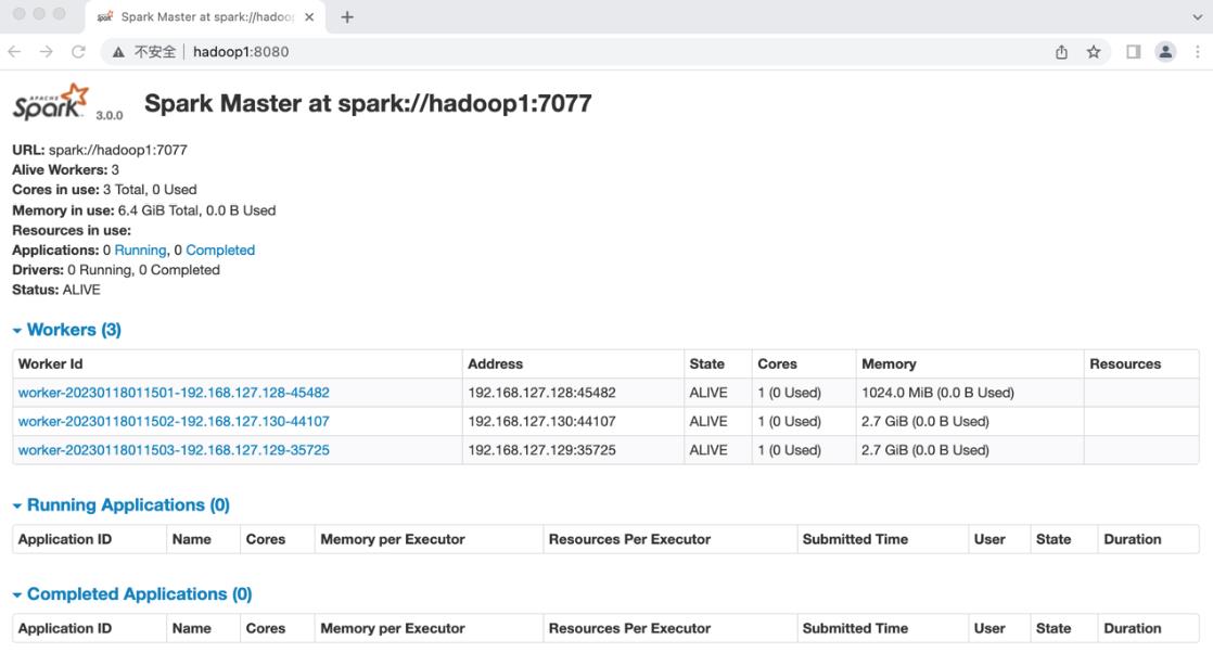(10)通过Web UI查看集群。可以通过主机名或者IP地址进行访问。默认端口号为8080,可以在浏览器中访问http://hadoop1:8080,如图1-10所示。