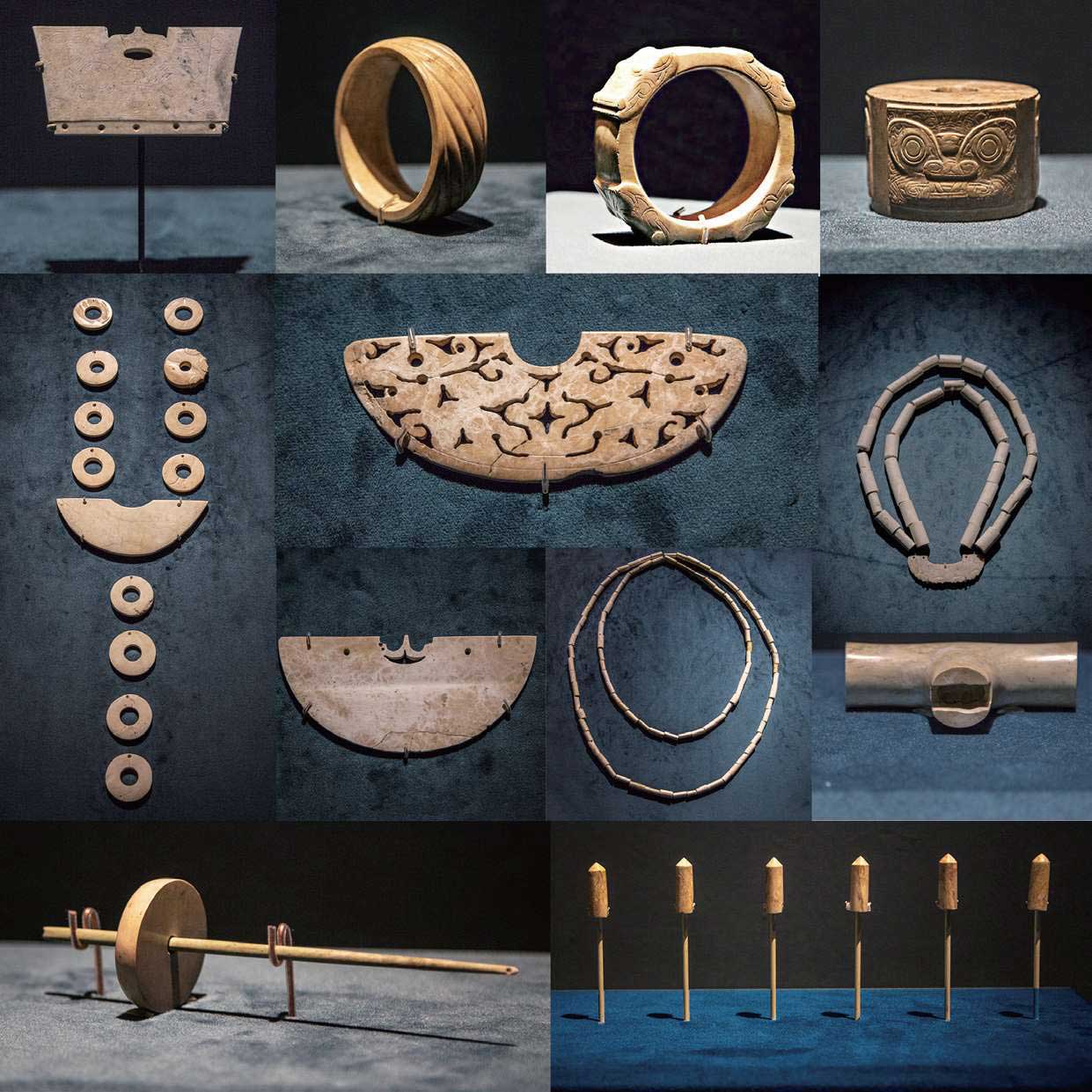 良渚文化玉器种类丰富、形制多样,主要有琮、璧、钺,以及冠状器、三叉形器、成组半圆形器、(成组)锥形器、璜、串饰、镯、带钩、(成组)柱形器、各类牌饰、端饰等40多种;玉礼器上常刻有神人兽面纹的“神徽”形象,是良渚古国共同崇拜的社会标识,用以表达良渚人的统一信仰。