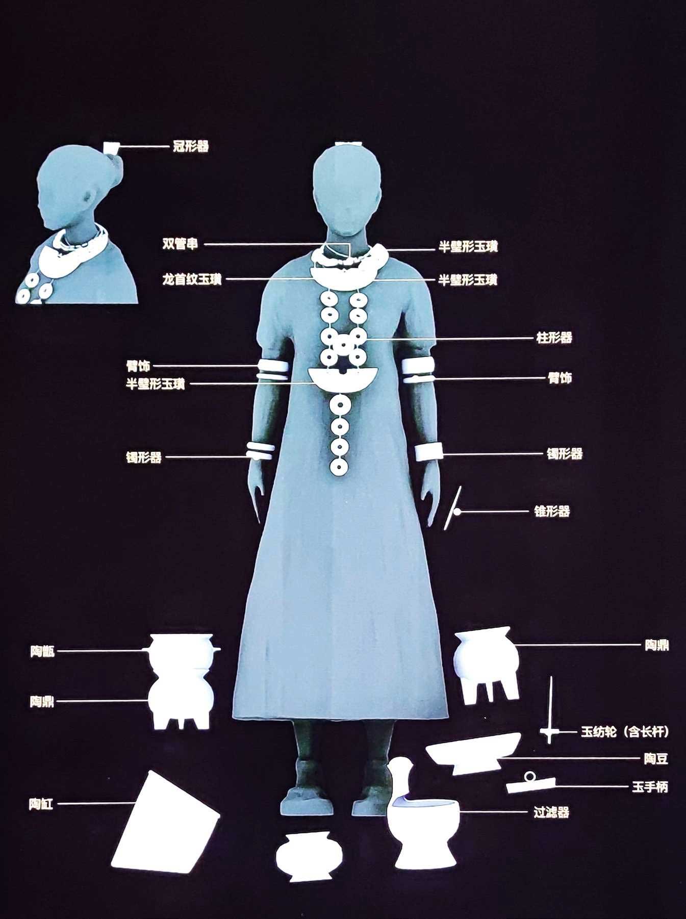 史前先民重视头饰或冠饰的现象,在各古文化遗址中都有发现,这是一种普遍的文化、观念和审美现象。玉器不仅是巫祀礼仪中与神灵沟通的重要物质媒介,而且也是拥有权位的显贵阶级最重要的装饰品。古代礼仪化玉饰品的佩带重点部位,会因性别、身份、礼仪形式和时代而有所不同。学者林淑心指出:“这种演化从文化内涵的角度观察分析,表现出明显的时代演化特征,极微妙地反映出文化中的阶级意识与玉饰巧妙的结合,形成中华古代冠服礼俗制度的独特精神内涵。”