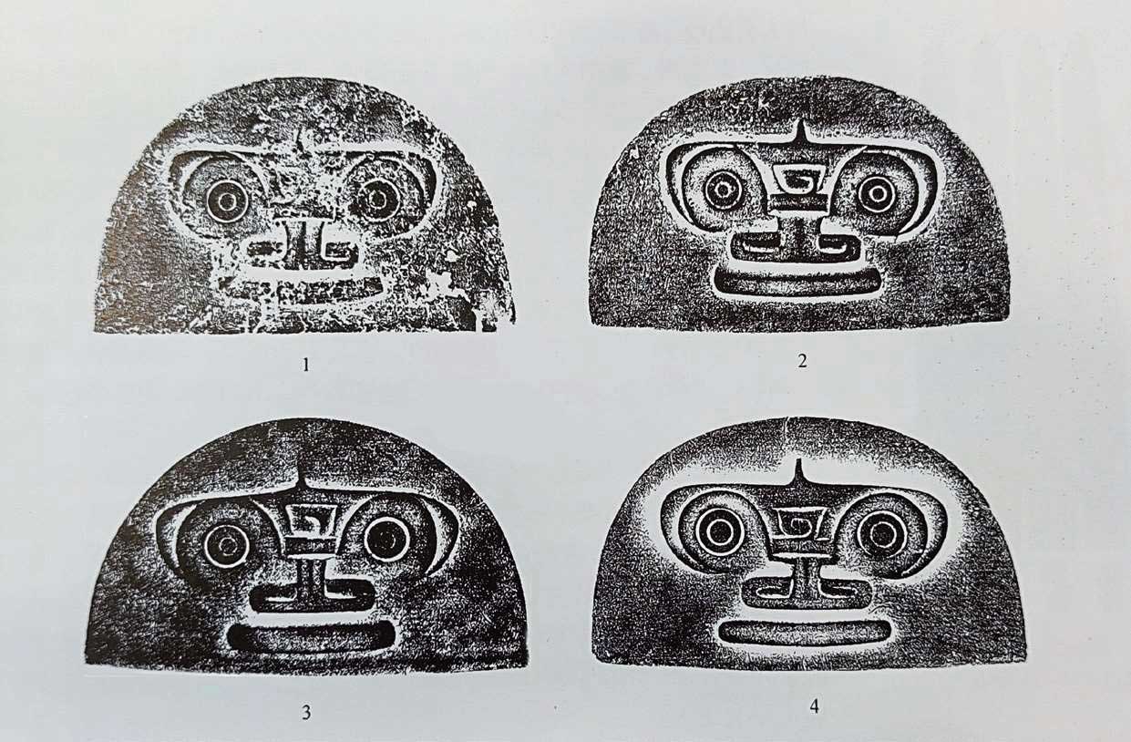 成组半圆形器:成组半圆形器(图2.10)极具地域特征,仅出土于反山和瑶山,如反山12、14、23、20号墓,以及瑶山12号墓,虽与墓主性别无关,但反山这四座墓葬和瑶山12号墓的随葬品数量和种类均居于同类墓葬前列,说明半圆形器是地位极高的权贵所独占的器种,只在高等级墓葬才会有。反山12号墓的成组半圆形器一共有4件,是唯一一组雕刻神像的,足见其墓主人地位之高。半圆形器正面弧凸,背面弧凹且有隧孔,出土时呈圆周状分布于墓主头部,推测原先应该呈等距状缝缀在皮革或丝麻等载体上,复原围径20―30厘米,可能是墓主头端佩戴的额带或冠帽的主件。
