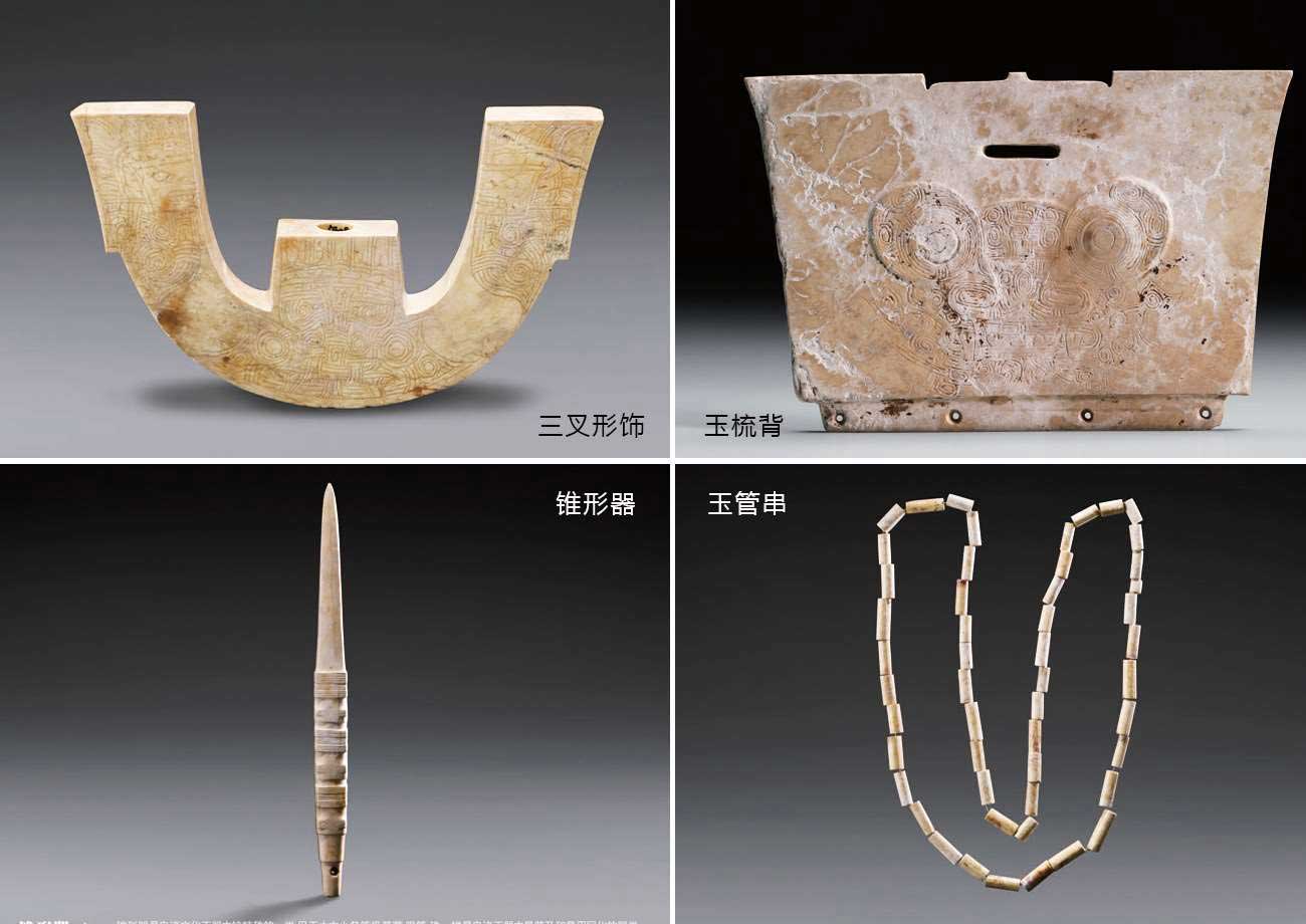 三叉形器:男性权贵的冠饰,中叉的上方往往紧连一根玉管,中叉下方的簪状插件朽烂不存。三叉形器仅为男性权贵所有,是典型的贵族男性身份的标识。这类主要分布于良渚遗址群和周边地区,以良渚遗址群和临平遗址群的出土数量最为丰富,在桐乡—海宁地区渐渐递减,不见于苏南和上海地区,地域分布特征鲜明。