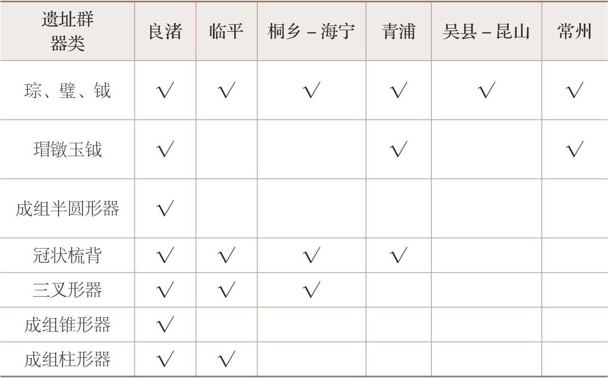 表2.1 良渚遗址群及周边地区遗址出土主要玉器的情况(空白表示少或阙如)