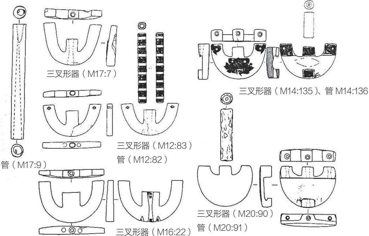 三叉形器(图2.9)形制独特,造型复杂。尤其是其背面的结构,有平面的,也有立体的凸块;有时背面也雕刻有精美纹饰,表明佩戴时可以从正反两个方向看到饰面。两叉的部位,有贯孔,也有卯孔,三叉形器贯孔均为对钻孔,无论背面有没有凸块,孔均为漏斗形,这样便于其他材质的簪的榫插,贯孔两侧的卯孔可以增加榫插时的稳定性。三叉形器中叉上方的长管均为贯孔,如果仅是中叉与长管的卯接,长管就无须贯孔,所以推测长管卯接后,长管的上方或许还可以镶插其他物件,比如羽毛等。三叉形器上还有类似的缝缀孔,形制不明,或许也可以镶插羽毛类的饰件。