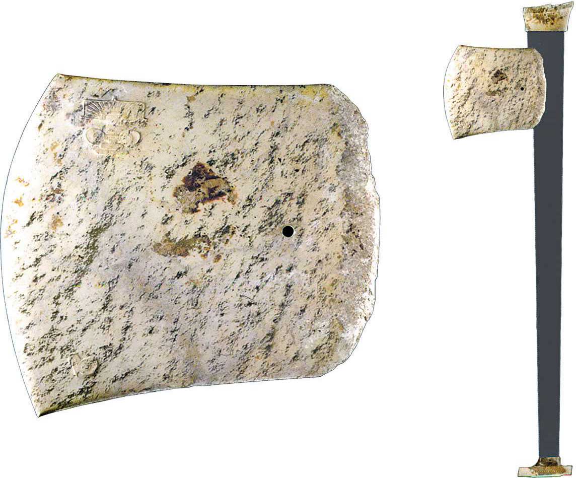 玉钺中的重器“钺王”(图2.6),与“琮王”出于同一墓中。玉钺的两面各刻了一个完整的“神徽”,神徽下方也有“神鸟”相伴。与之相配的还有玉钺两端的装饰(瑁和镦),也就是安上柄后位于木柄头尾端的玉质装饰。这类装饰在刚发现时尚不知为何物,发掘者曾经根据外形称其为“舰形器”;后来,在发掘中观察到了它们和玉钺配套放置的情形,又对照其他完整的石钺模型,才确定了它们与玉钺的组合关系。这种豪华玉钺仅发现于良渚遗址群,以及上海青浦福泉山、江苏苏州草鞋山和常州武进寺墩等极少数的高等级聚落中,彰显了“王权神授”的远古统治观念。周武王伐商的时候,曾有“武王左杖黄钺,右秉白旄”的记载。而玉钺(如反山钺王)通常位于墓主左侧,可能是左手所持。