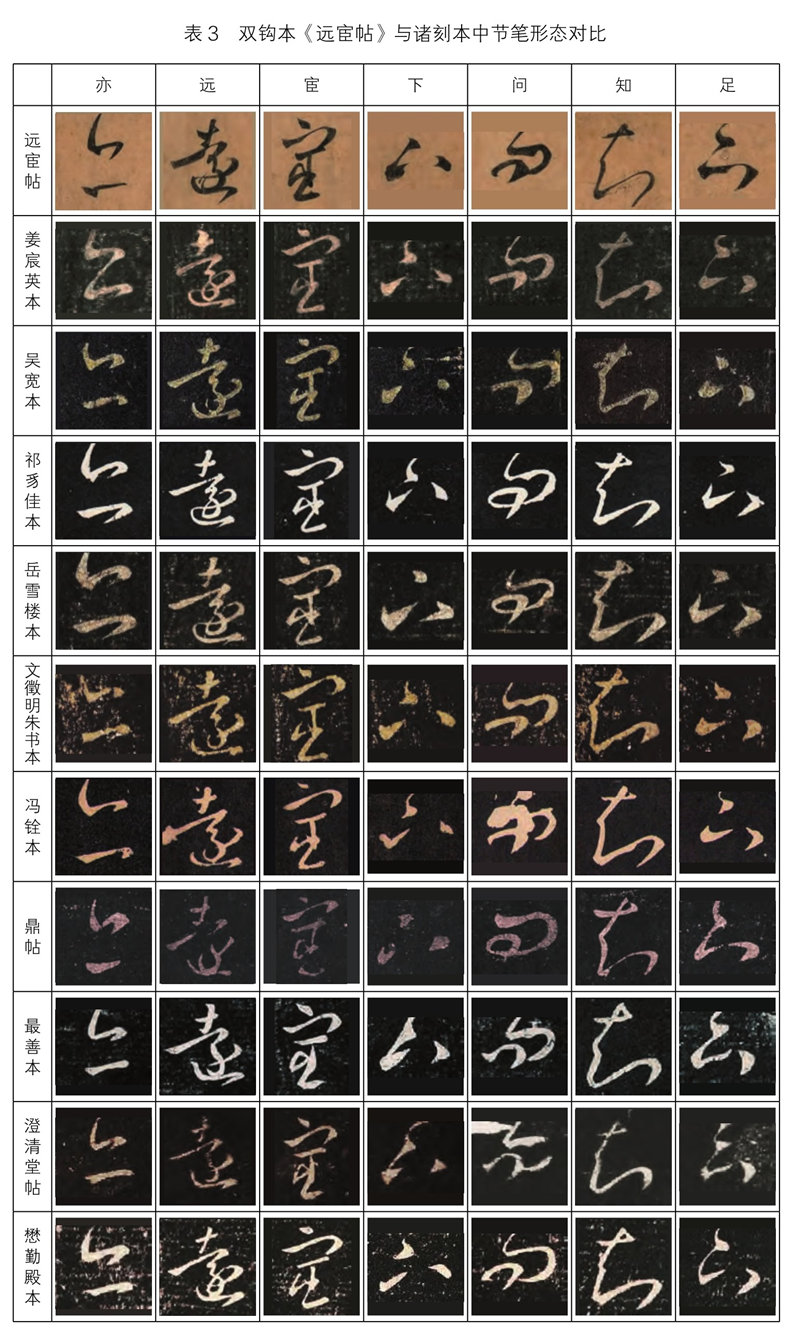 《鼎帖》虽然摹刻不佳,相较那些书法史上的著名刻帖,却意外地保存较多双钩本的特征(参见表3)。首先是第二行的“情”字收笔处与双钩本《远宦帖》一致,往右出锋,而非敕字本《十七帖》中的往下(参见表1)。“宦”字的节笔痕迹相当清晰,不像敕字本《十七帖》中已经完全被修饰成平整线条。“远”字在双钩本《远宦帖》中的节笔后半呈现细丝状,或许是出于摹刻过程的误差,才会出现《鼎帖》本中线条消失的状况。第四行末字“笃”的收笔方式完全与双钩本《远宦帖》相同(参见表2)。末行的“知”字也很有趣,《鼎帖》本呈现出细线般的笔画形态,反映出刻制者在不了解双钩本《远宦帖》残损的情况下,进而将之合理化。敕字本《十七帖》中第四行的“问”字的怪异节笔在《鼎帖》本中则完全被修改掉。事实就是,《鼎帖》本虽然也经过翻刻且摹刻不精,却因为保留许多与双钩本《远宦帖》相同的特征与节笔痕迹,反而显示出其与双钩本《远宦帖》的亲近关系,而向来被认为刻摹精良的敕字本《十七帖》反而与双钩本《远宦帖》相去甚远。