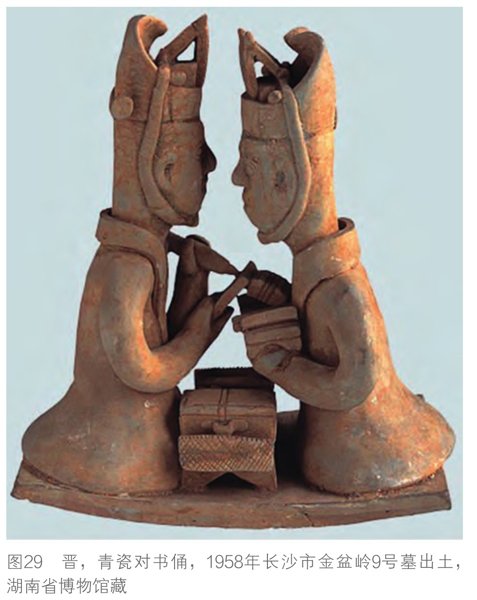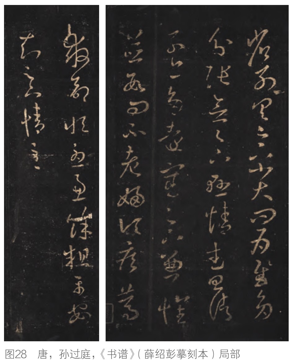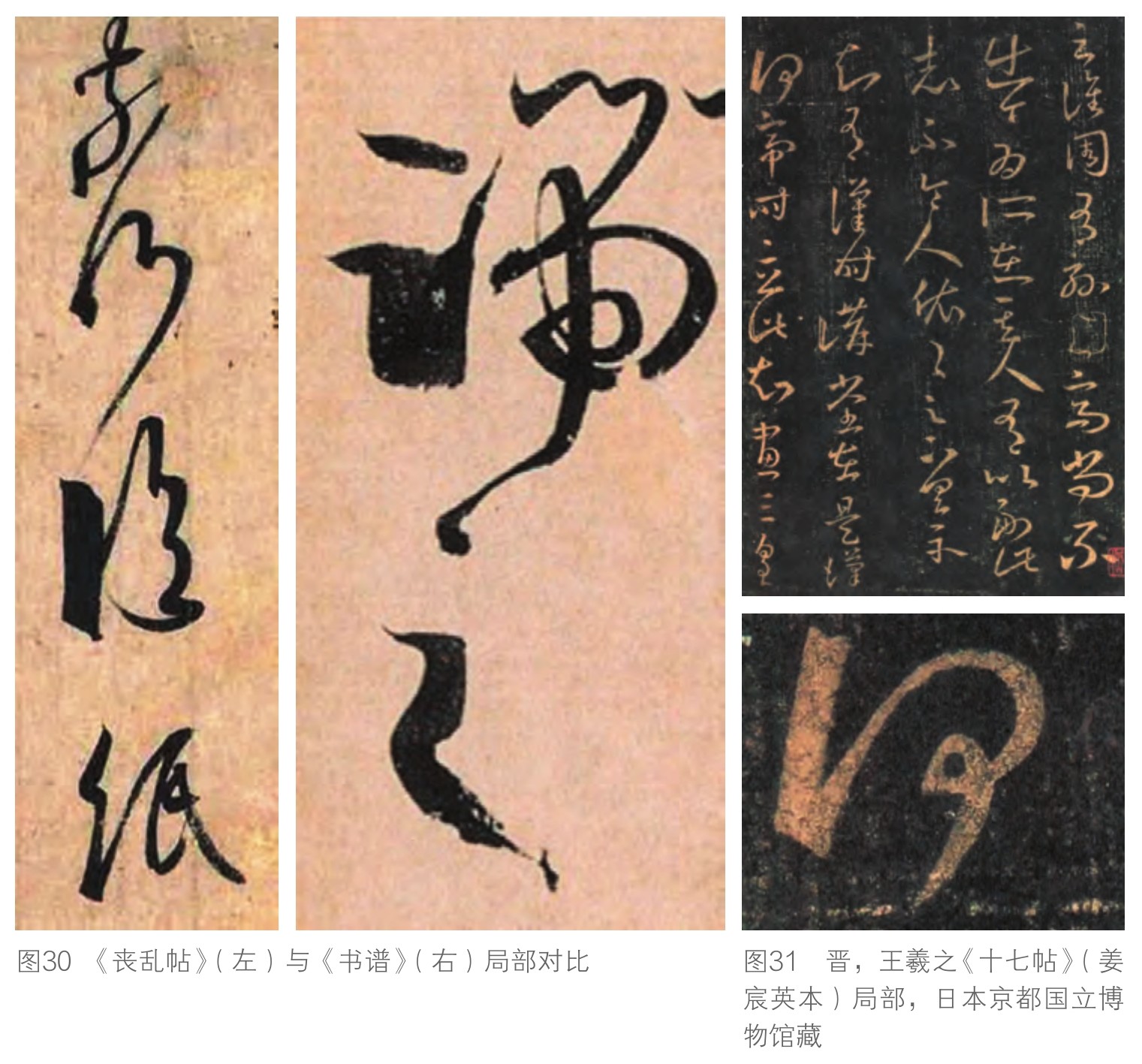 宋以后利用桌子书写,此彻底地改变了书写的方式,书家不需要像古代那样持拿在手中书写(图29),也不再借由折纸来加强书写面的强度,因此跨写在折纸痕上的节笔便消失无踪,使得时人对于节笔可说是完全陌生。这种对古代节笔的陌生感,加上缺乏原迹的比对,确实容易在每一次的翻刻过程中有意识地去修正这些怪异的节笔,调整成比较符合自己视觉经验的自然线条。尽管如此,有些特别夸张的节笔并不是那么容易处理,例如《丧乱帖》与《书谱》中左侧偏锋的宽扁粗线条(图30),在《十七帖》中就被处理成很怪异的笔画(图31)。敕字本《十七帖》中的节笔被整形到难以辨认的状况,已经反映出这些刻本的年代上限,不会早于节笔消失的北宋时期。