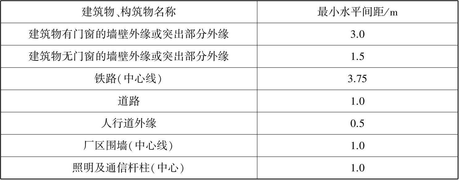 表2.1 管架与建筑物、构筑物的最小水平距离