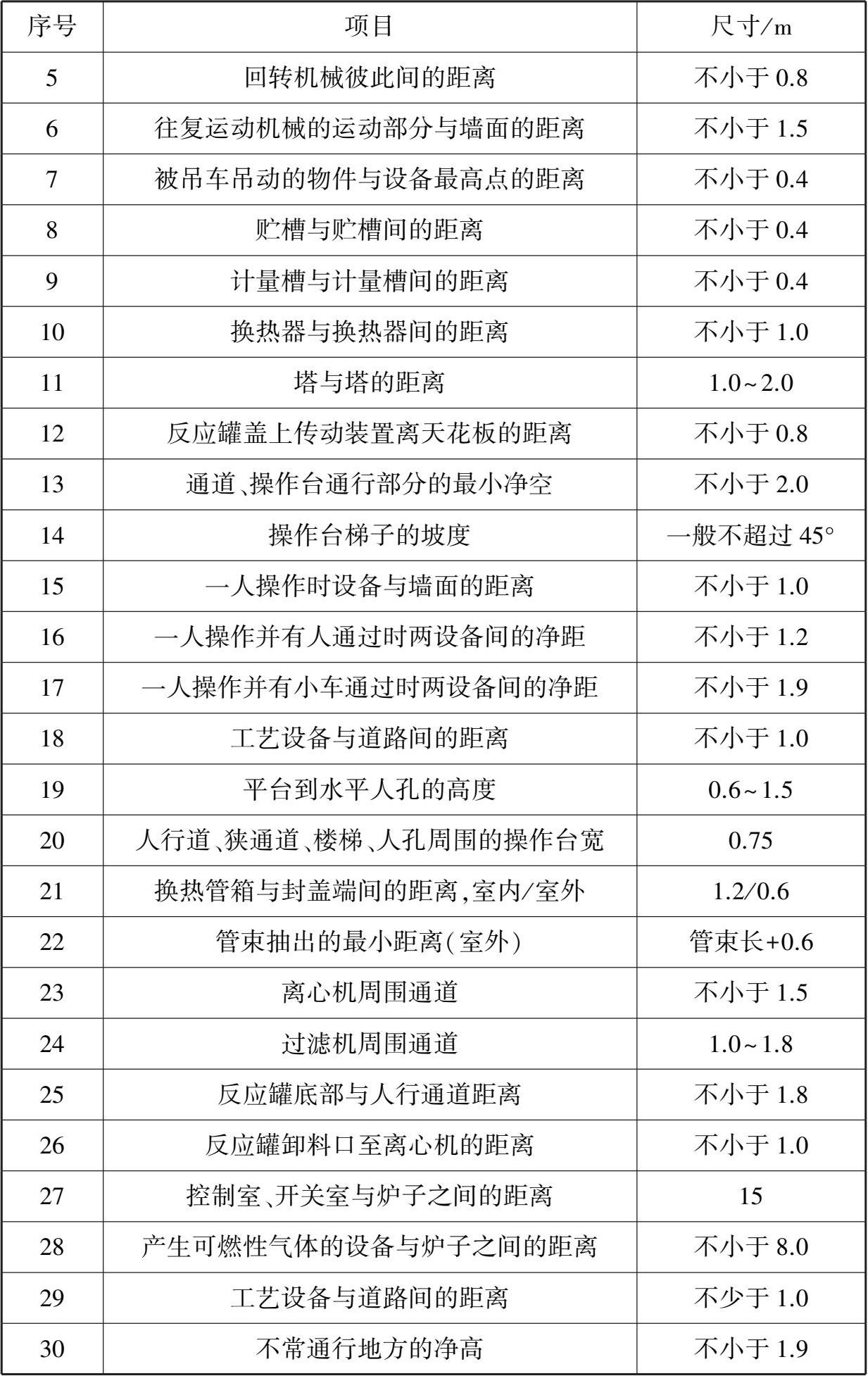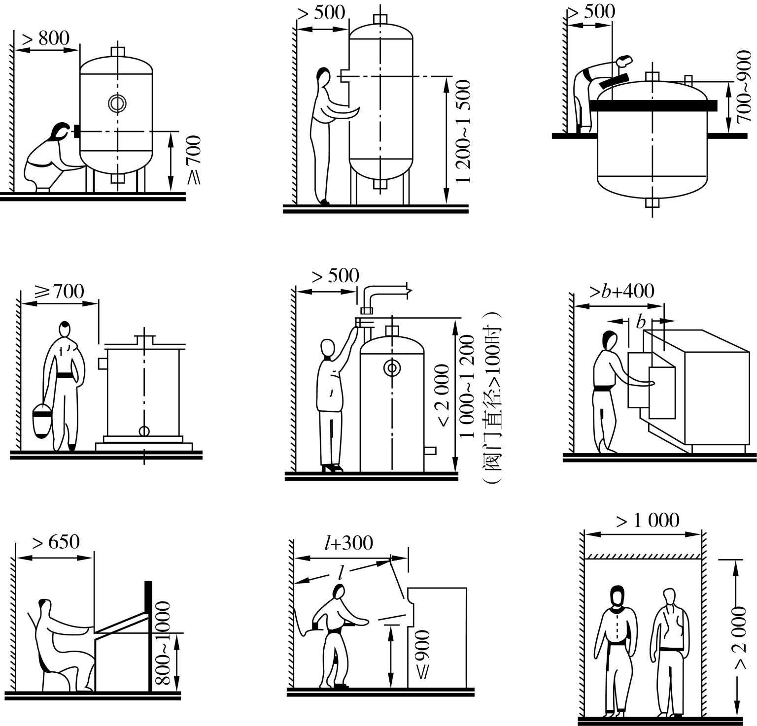 ③设备布置时除了要考虑设备本身所占的面积外,还必须有足够的操作、通行及检修需要的位置。