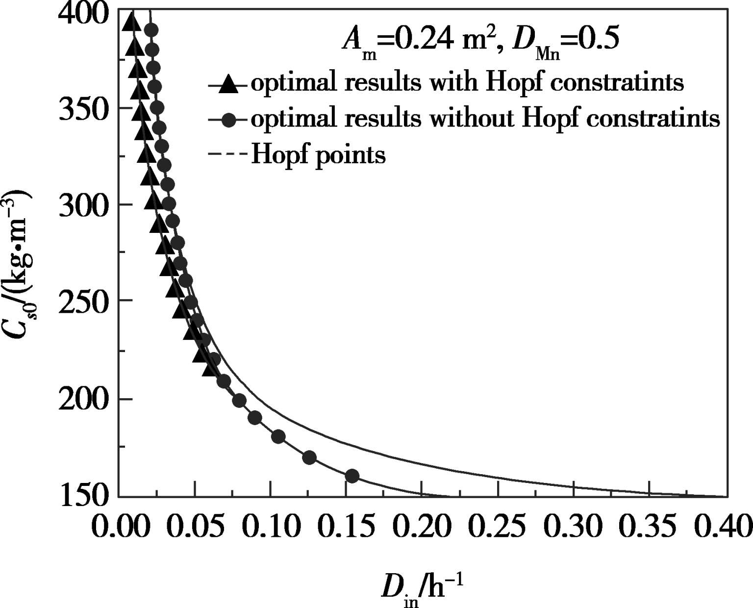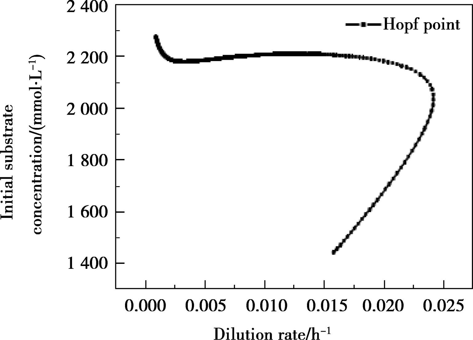 在该体系中,随着操作条件的变化,Hopf奇异点的位置也发生改变,在由两个主要操作参数组成的操作平面内,Hopf奇异点的分布如图3.2所示。