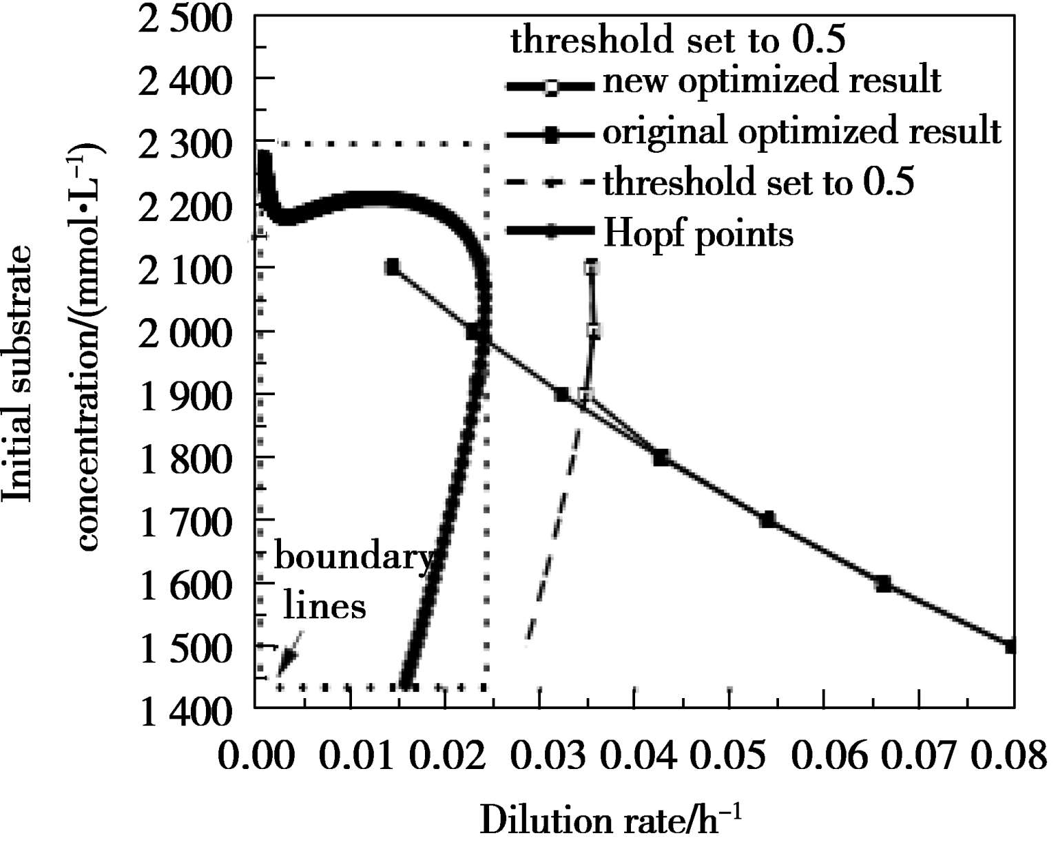 由两个操作参数组成的操作参数域上,体系的Hopf奇异点的分布如图3.7所示。由图可知,在大范围的操作参数域内,都存在奇异点。为了避免从操作点引发的振荡现象,需要与奇异点区域保持一定的距离。此时,对操作点进行优化,得到的结果如图3.8所示。