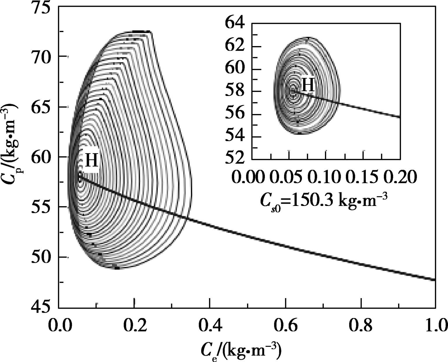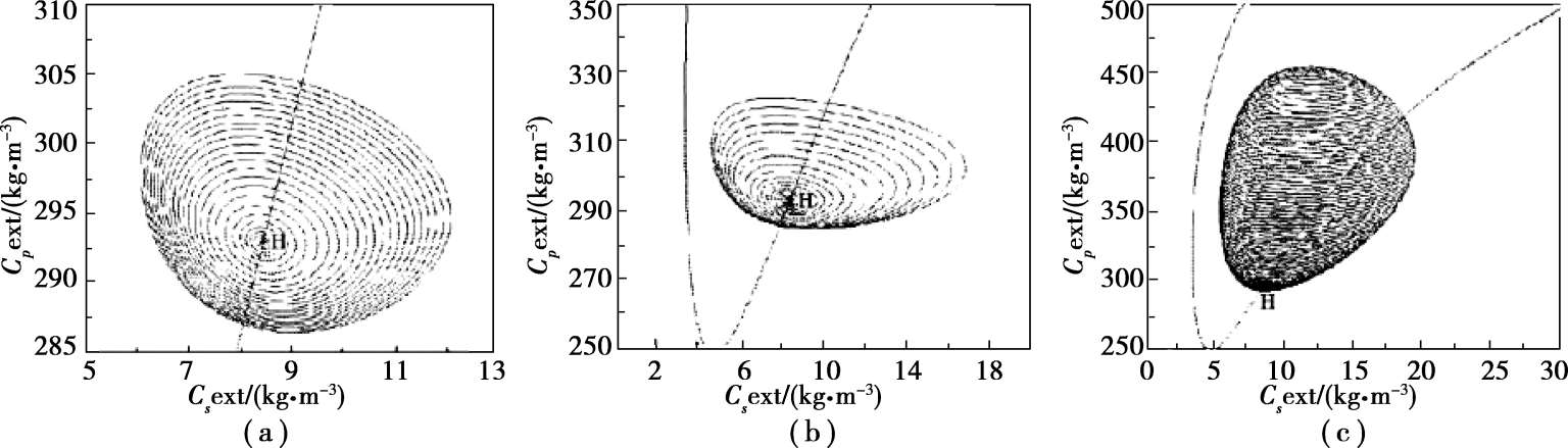 运动发酵单胞菌连续发酵生产生物乙醇。有文献报道,与稳态操作相比,振荡行为难以预测和控制,影响产物收率,因此,需要加以回避或使之弱化。运动发酵单胞菌发酵过程中存在奇异点,在奇异点附近产生的极限环如图3.5所示。周期性变化的振荡现象对于操作过程的平稳以及产品质量的提高都不利,因此,需要在设计阶段采取适当措施规避振荡现象。