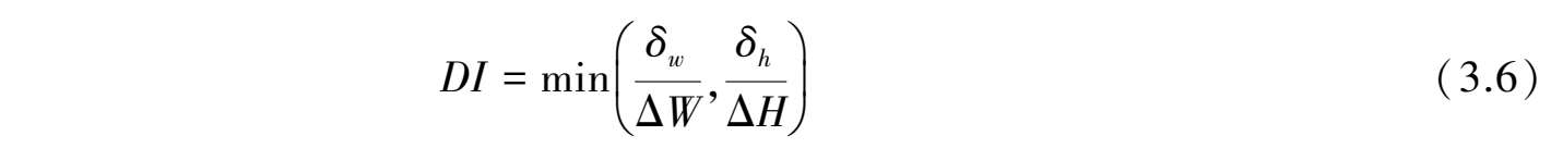 其中,Δ W 和Δ H 分别表示奇异点区域的宽度和高度; δ w和 δ h分别表示操作点距离奇异点曲线的水平距离与竖直距离,因此, DI 描述了操作点距离奇异点曲线的相对最小距离,具体内容如图3.3所示。使用量化表征的操作点与奇异点区域的距离,优化计算最佳的操作参数。当阈值为0.5 时,即允许的 DI 最小为0.5 时,优化结果如图3.4所示。