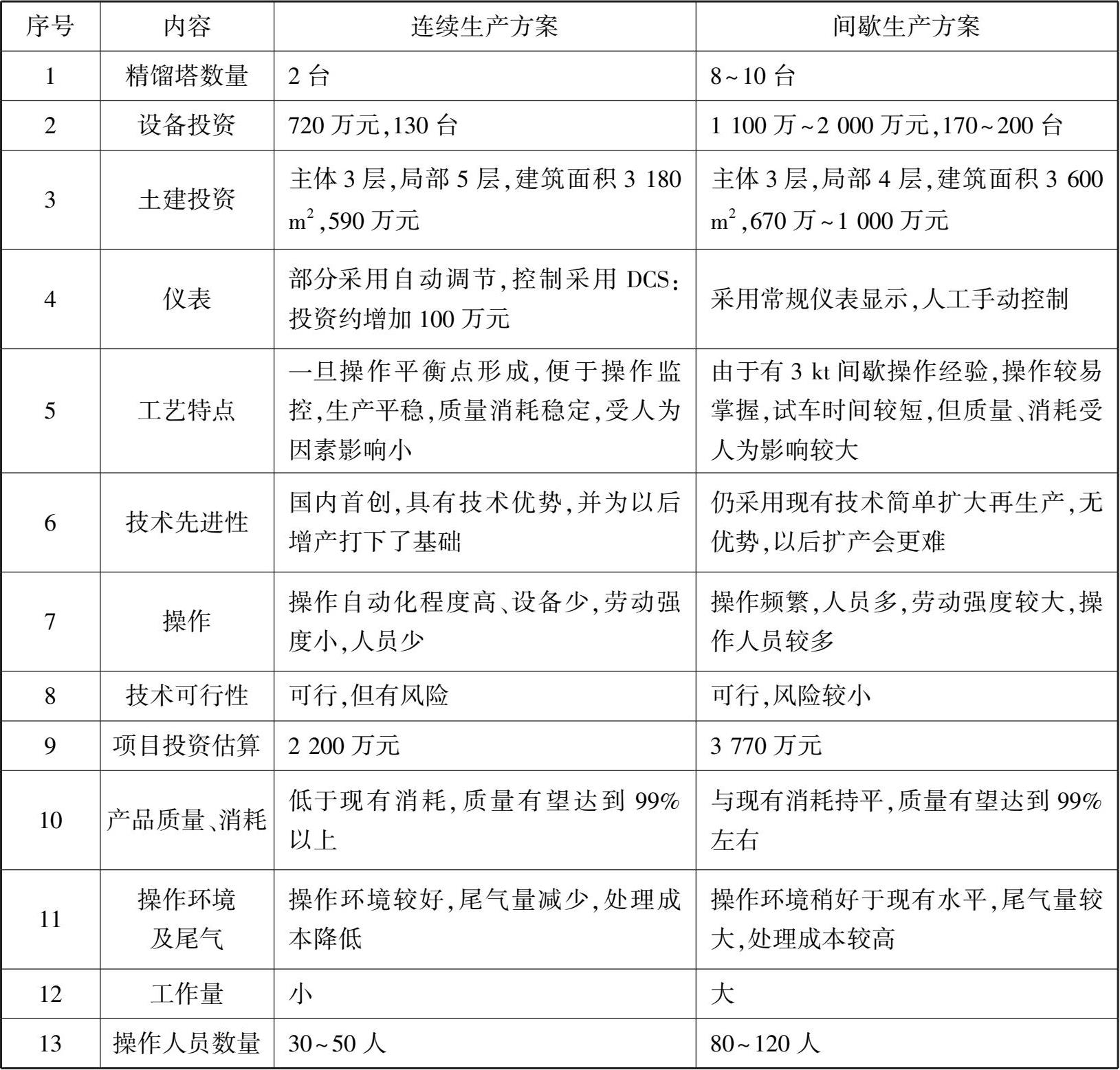 化工过程强化的目标不能只停留在使已有设备提高百分之几的效率,不能满足于渐进式的变革,而应致力于在设备体积、产业化周期、能耗、物耗和环保等方面使工厂的效率取得突破性的进展。因此,对工艺过程的研究非常重要。例如,在某厂化工项目中,对其工艺过程提供了两种方案并进行对比,结果见表3.2。从表中可以看出,连续精馏的工艺过程能减少投资、降低能耗、节省人力物力,并为以后的扩产打下基础,具有明显的技术优势。