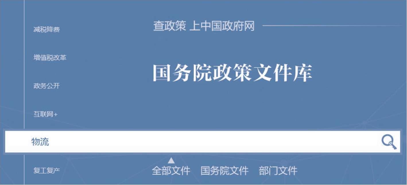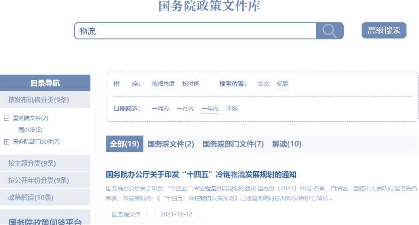选择“国务院政策文件库”,进入搜索页面,输入关键词“物流”进行搜索,如图1.1.4所示。